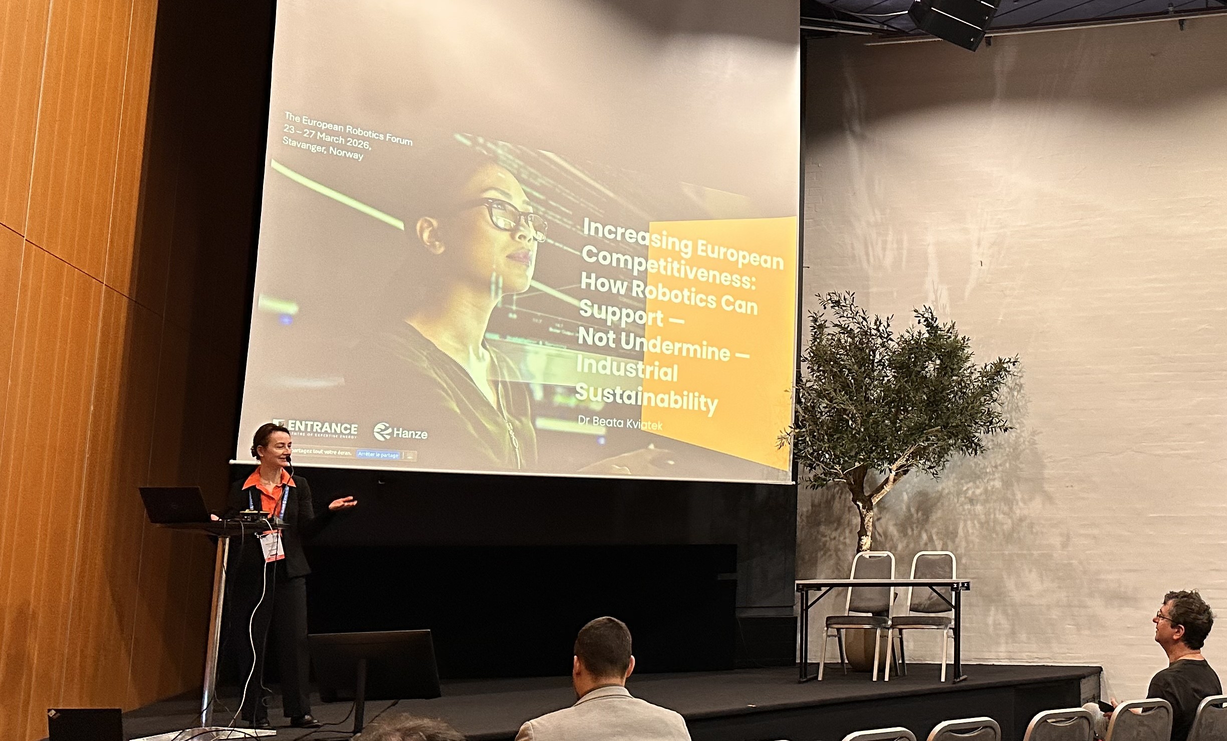 In March 2026, Dr. Beata Kviatek, Jean Monnet Chair in Sustainable EU Economy at Entrance – Centre of Expertise Energy of Hanze University of Applied Sciences, delivered an invited talk at the European Robotics Forum (ERF2026)—one of Europe’s most influential annual events in robotics and artificial intelligence. Her contribution positioned Hanze within a growing European debate on how robotics can strengthen competitiveness while supporting, rather than undermining, industrial sustainability.