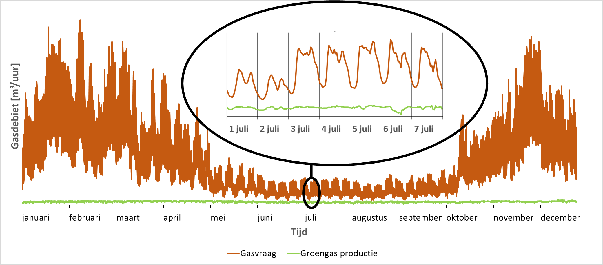Sander: Goede vraag! In de winter gebruiken we natuurlijk veel gas voor onder andere het verwarmen van ons huis en in de zomer hoeft dat niet, dus gebruiken we logischerwijs veel minder. Wat dit ingewikkeld maakt is dat de productie van groen gas heel continue is en het duurt ook vrij lang. Je stopt er op dag een beetje biomassa in en pas na circa 30 dagen kun je er gas uit halen. Dus het idee is dat je er elke dag een beetje in stopt en er elke dag een beetje gas uitkomt. Maar dat is dus vrij continue, terwijl we niet het hele jaar dezelfde hoeveelheid gas nodig hebben. Dat betekent dat we op een bepaald moment in het jaar meer groen gas produceren dan we kunnen verbruiken en, tja, waar moet je dat dan laten?