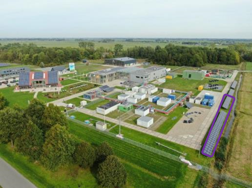 Binnen een onderzoek naar het effect van schoonmaken van zonnepanelen bekijken we de opbrengst van een deel van het zonnepark op ENTRANCE, in Figuur 1 zijn deze panelen paars omlijnd.